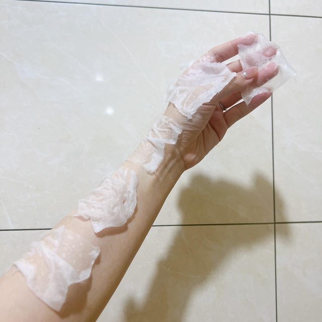 將撕開後的五片化妝棉再拉長充分濕敷全臉