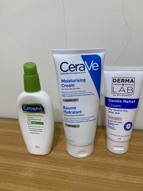 由左至右:舒特膚日常保濕乳液、Cerave長效潤澤修護霜、Derma+ Lab德美醫研長效舒敏乳