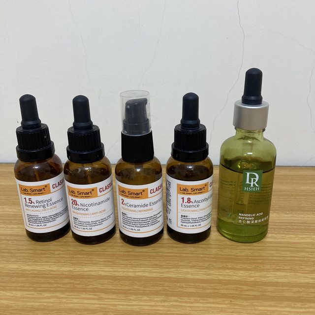 我目前有五瓶,由左至右為:1.5%A醇、20%B3、2%神經醯胺、1.8%維生素C糖苷、10%杏仁酸