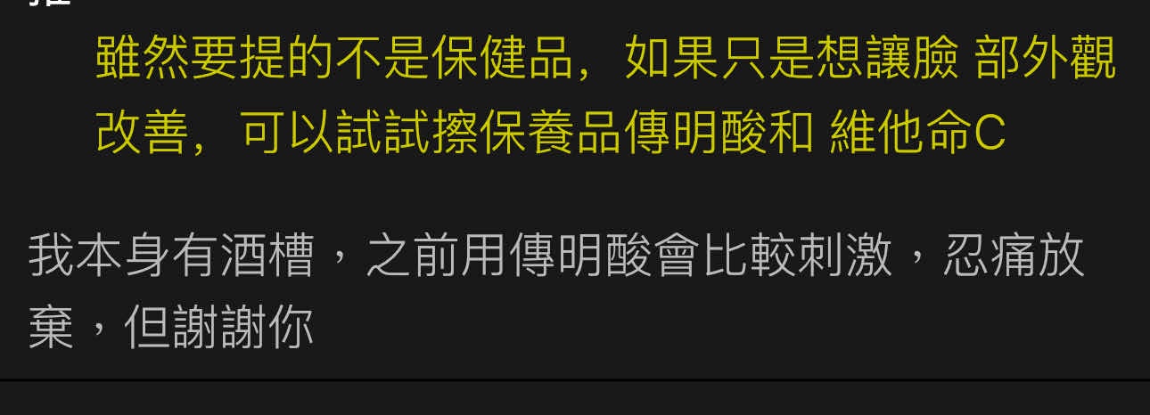 → focus0120: 部外觀改善,可以試試擦保養品傳明酸和 218.173.27.1 06/14 15:02