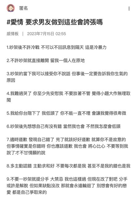 看到這種文章真心覺得很問號 在感情中當然有一些自己的底線 這我覺得很合理 但當你列出說應該怎樣 應該怎樣的 就好像給對方非常多的規則 https://i.imgur.com/9aeA5Go.jpg