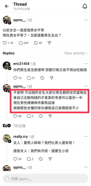 : 反過來男的每餐都要女的請不就是男的自私小氣?