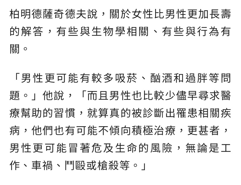 噓 QuakerH : 真的不要臉上貼金了,男性短命是因為不良習慣較多, 01/19 23:44