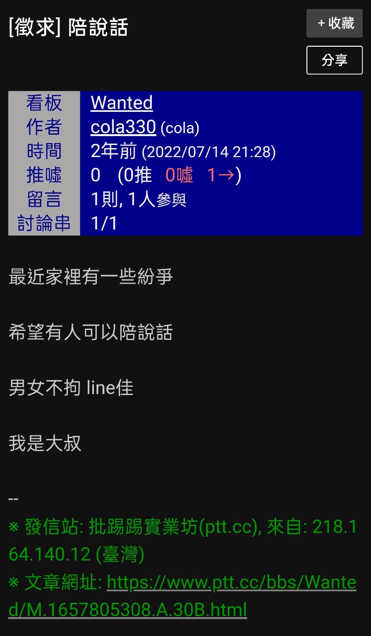 → boalover : 現實生活連一個願意陪他講話的人都找不到,又窮又孤 04/22 10:19