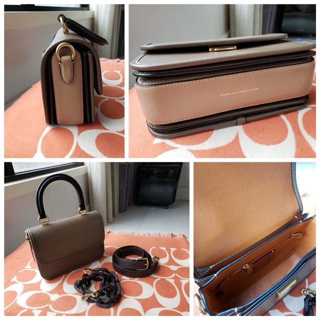 旁邊是拼一個稍淺的棕色,把手及背帶是深一點的咖啡色。