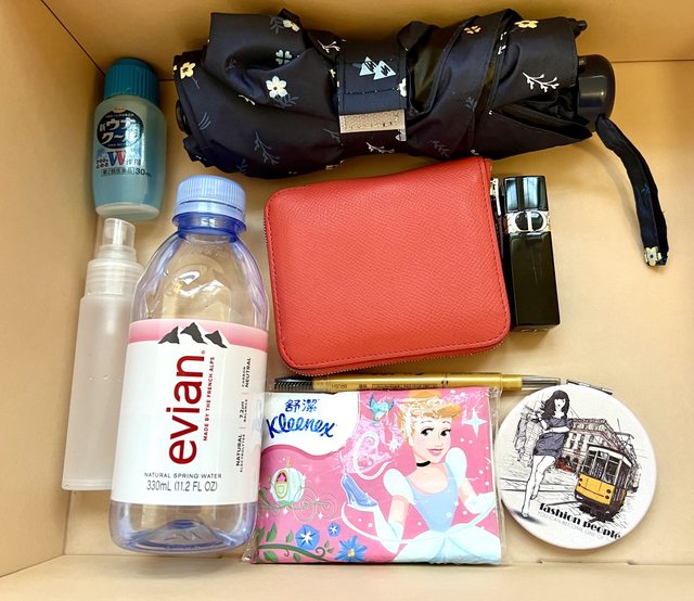 可以放下手機、護照、口紅、眉筆、鏡子、護唇膏後還有些微空間。