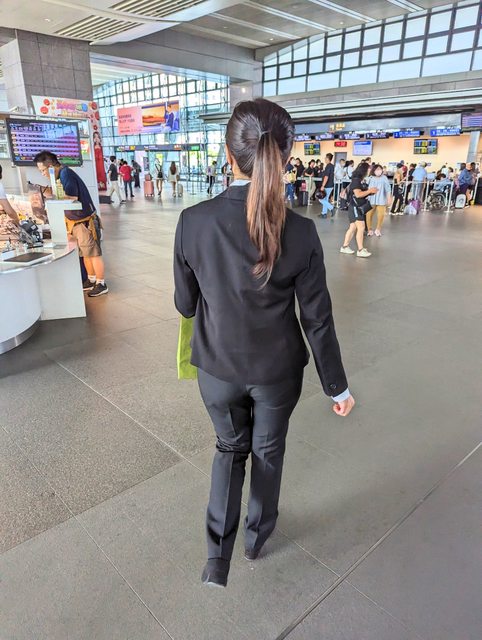 人員到高鐵月台舉著gucci綠色紙袋引導辨識,