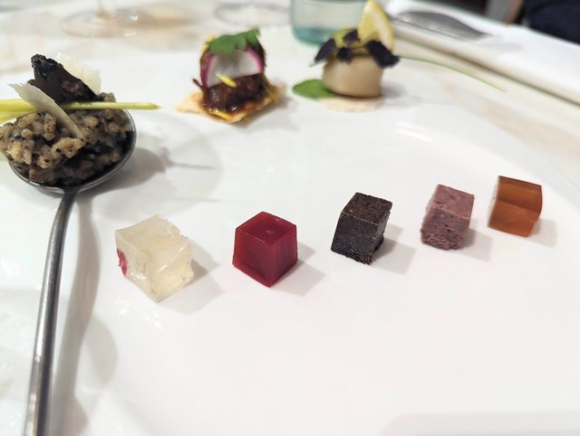 五個方形沾醬,依序是搭配五款點心