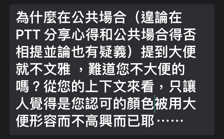 推 laconism: 我的意思是在公共場合講大便不太恰當,並非用排泄物來講 06/30 14:44