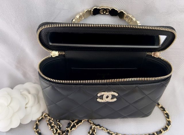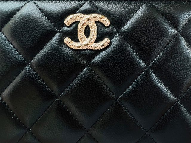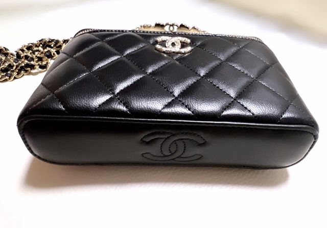 特寫一下充滿熔岩感的香檳金雙C logo,與好看但嬌嫩的小羊皮菱格。