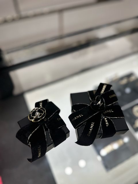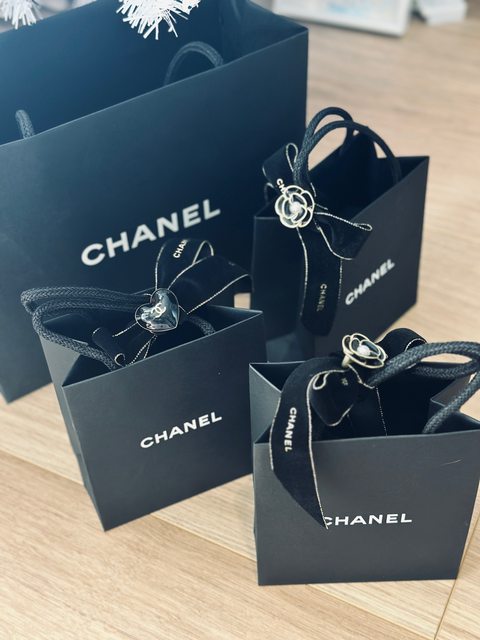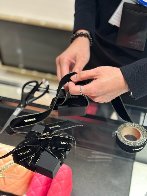 一定要分享Chanel的聖誕限定包裝,黑色絨面鑲金絲邊的緞帶,搭配山茶花或雙C釦。本