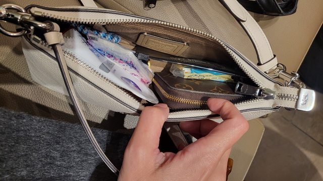 內襯是奶茶色的,很好看,有個簡單拉鏈格層,容量其實滿夠的,手機、零錢包,冬天必