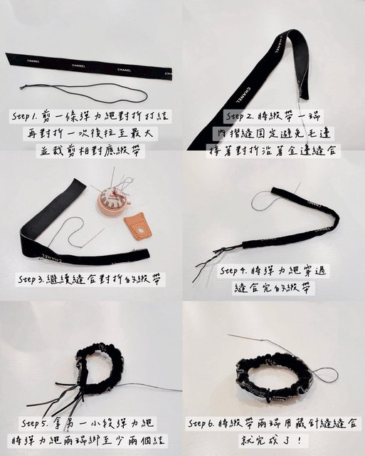 Step4. 將彈力繩穿過縫合完的緞帶,這裡使用髮夾輔助會比較容易!