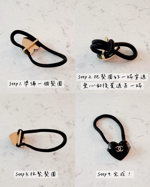 Step2. 把髮圈的一端穿過愛心釦後套過另一端
