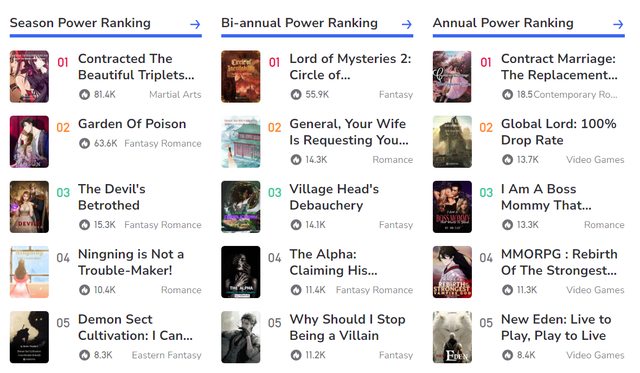 看一下英文站的排行 (簽約作品、Alltime、男頻、包含翻譯跟原創)