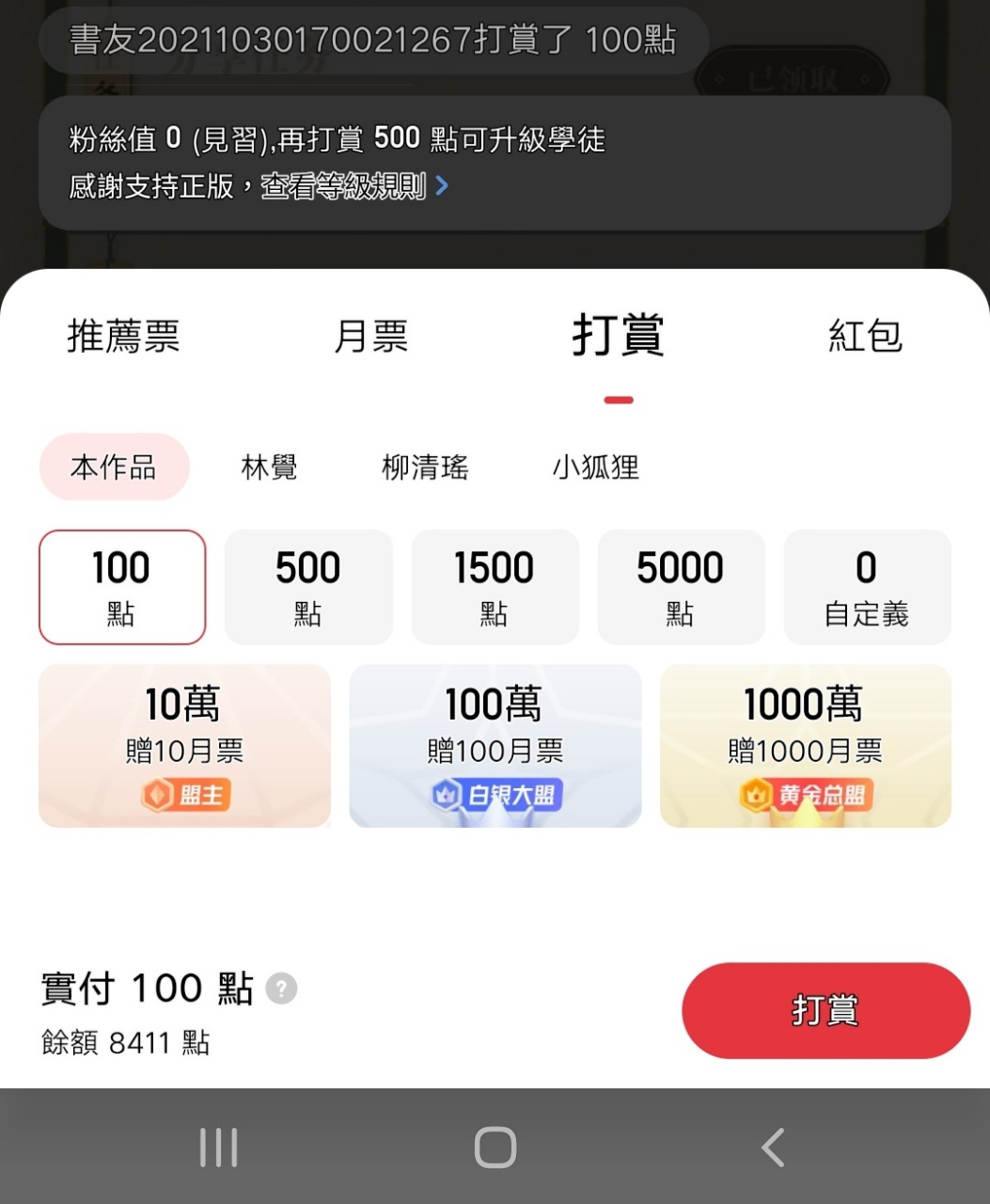 → sheep0121 : 起點志怪書的活動點“打賞任務”可以看到能打賞的 07/04 02:45