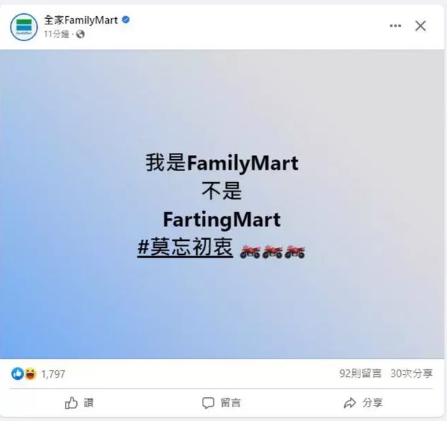 YouTube影片「山道猴子的一生」爆紅,主角設定為超商店員,最終悲劇收場,穿著制服神似全家超商,但名稱為「Farting Mart」。「全家FamilyMart」臉書粉專今天下午發文表示,「我是FamilyMart,不是FartingMart」,並標註「莫忘初衷」,呼應影片中主角穿著的衣服圖樣。