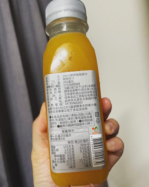 【規格/內容物/熱量】:265cc/椪柑原汁/132kcal