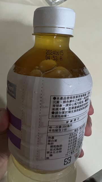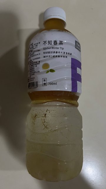 然後剛剛拿到其中一瓶發現沈澱的很怪(如圖),我的飲料都是平躺的,他的沈澱卻是往瓶蓋方向飄去?(未開封過)