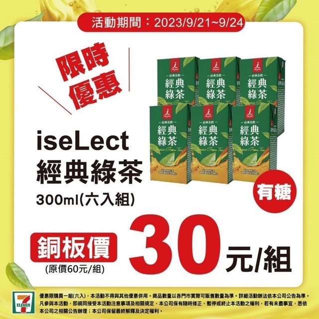 7-11 iseLect經典綠茶 300ml 6入 30元
