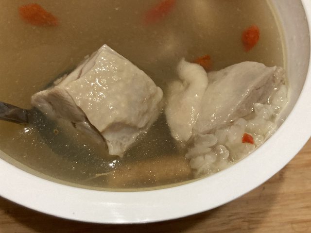 人參糯米雞湯:料不算多,塞塞牙縫還可以,天冷了能喝到一碗熱熱的湯品還是不錯的,