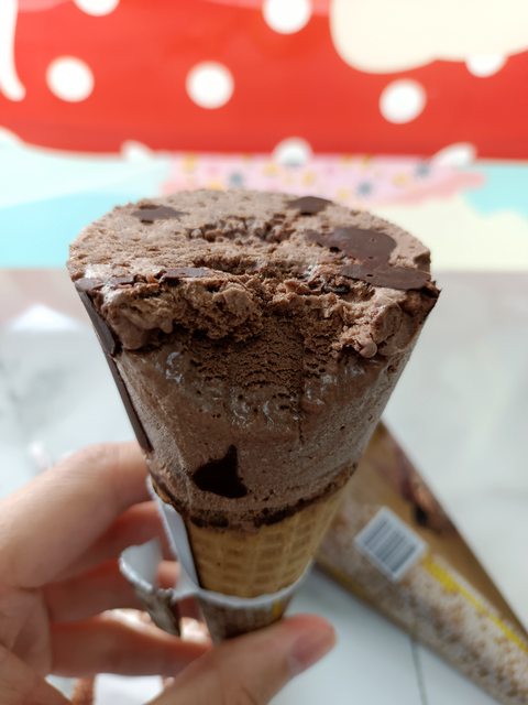 感覺和桶裝的巧克力冰淇淋有差 比較沒味道 固體的巧克力很少 應該只能叫1.3倍巧克力 不算好吃 要吃巧克力不如吃阿奇儂的戀乳雪糕 然後甜筒的包裝設計 除了外層的紙 最上面還有一片蓋子 拆開時很難不沾到手 吃餅乾時又會掉碎屑 不適合在沒有衛生紙和洗手台的地方吃 -- https://youtu.be/js4B1vQLmuo