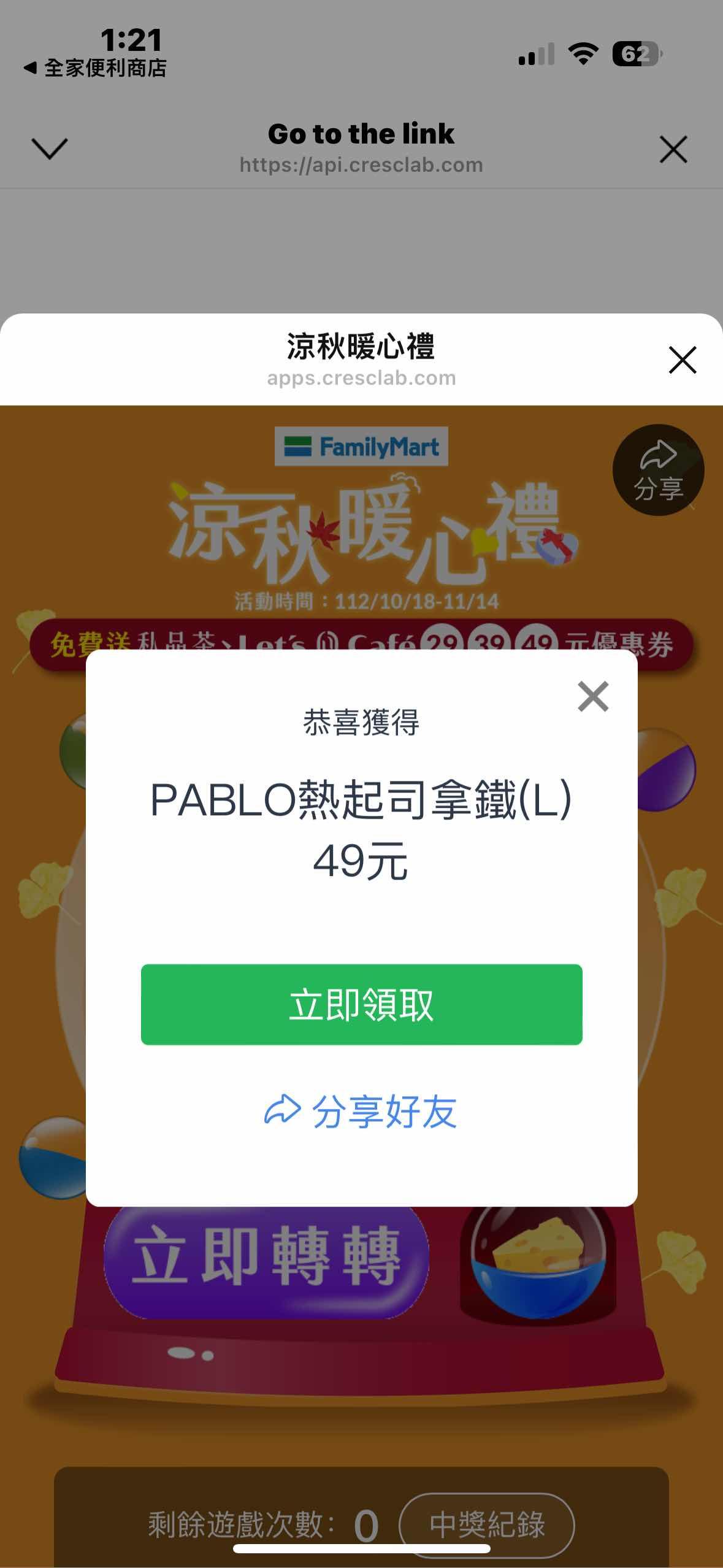 【商品名稱/價格】:Let’s CafPABLO起司拿鐵/$49 【便利商店/廠商名稱】:全家 【規格/內容物/熱量】:大杯/307大卡 【評分】:85 【心得】: 玩line遊戲抽到49元優惠買來喝看看 https://i.imgur.com/do9B2vv.jpg