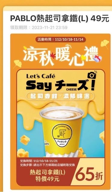 很喜歡喝起來是有點帶鹹的起司味 配著上層的奶泡感, 會有種在喝鹹奶蓋的感覺 起司味很香很濃郁, 但還是能喝到拿鐵的咖啡香跟奶味 沒抽到優惠的話報會員也有特價65 覺得很好喝誒會再回購 https://i.imgur.com/tgEovYD.jpg
