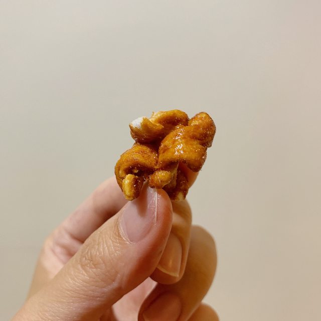 米花外表幾乎算是蠻均勻裹滿的焦糖醬,焦糖的口味很濃,帶一點點微微苦味,但吃起來