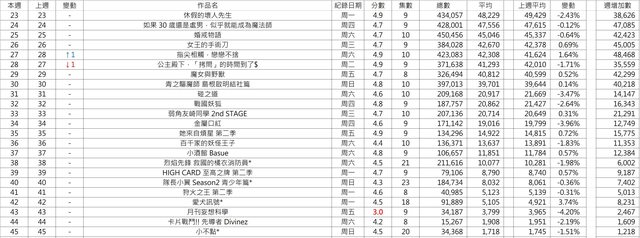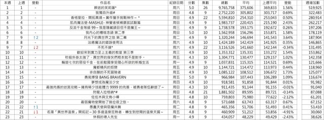 #:有總集篇、特別篇或中配,為使比較基準一致,將一律排除,但也不會加進分母中。