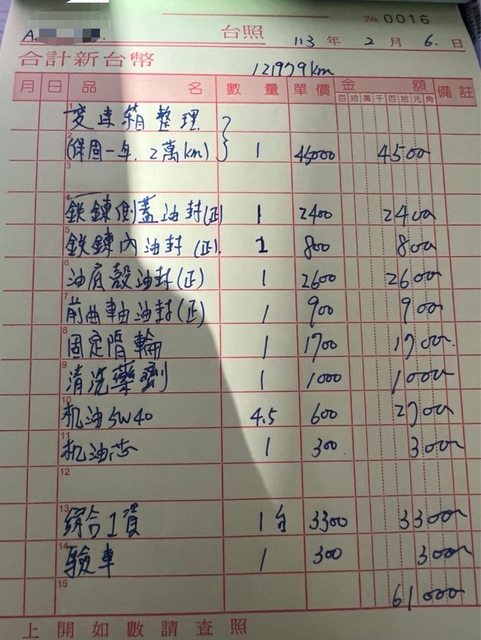 全車避震去年花三萬更換,變速箱已於今年2月大保養預防性換新,花費6萬元,變速箱保