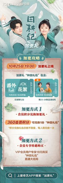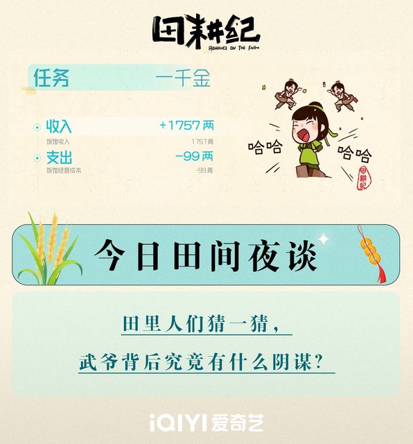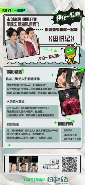 10月14日起,VIP會員每周六至周三19:00各更兩集鎖定 (首日VIP集,免費兩集)愛奇藝 田耕紀,有田有閒,撒歡搞錢! 《田耕紀》是由愛奇藝出品,中文奇蹟聯合出品 導演:洪泠、張書蘅(聯合導演)執導 編劇:金媛媛擔任(總編劇)、楊偉凱、盧漫川、馬薇 大綱 本劇改編自作者弱顏的小說《重生小地主》,以宋代田園農耕生活為背景 ,講述了沈諾 與連蔓兒攜手智鬥親戚,種田經營,發家致富,並在過程中相知相愛的故事 。 家宅很寧版預告 https://video.weibo.com/show?fid=1034:4955954379423804 人物關係圖 https://i.imgur.com/yPNtgxX.jpg