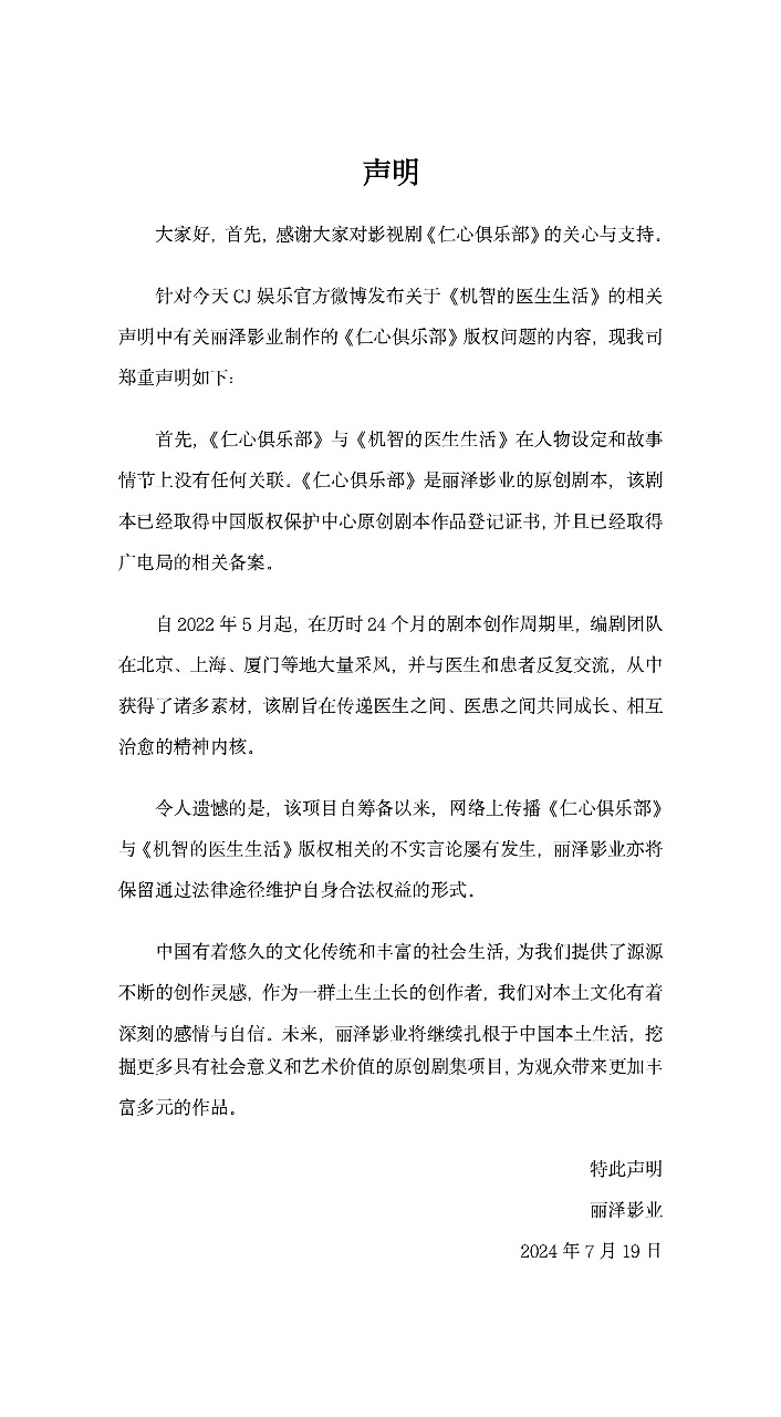 藉此,鄭重提醒廣大網友和媒體朋友,傳播關於《機智的醫生生活》版權的不實言論將可