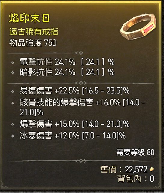 物 品:D4 戒指 易傷22.5% 爆傷15% 駭骨爆傷16% 冰寒傷12%