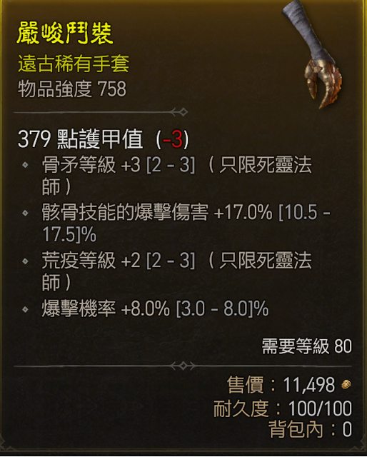 標題[競標] D4 S1 死靈手套 骨矛/骸骨爆傷/爆率