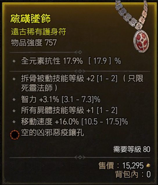 標題[競標]D4賽季死靈項鍊 拆骨2/近頂跑速/智力% 橘