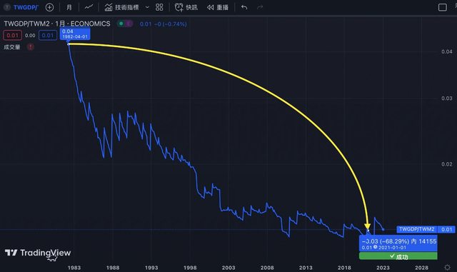 至個比例長期下滑,表示雖然台灣 GDP 長期增長,但是貨幣供給 M2 增加得更快,目前
