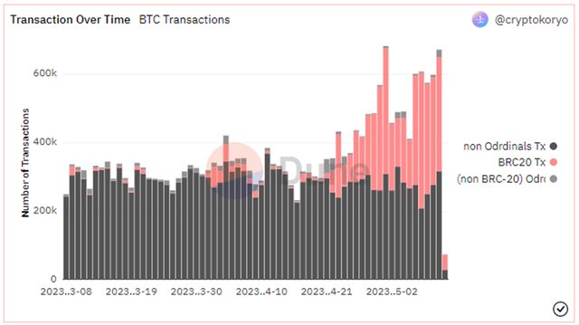 4 月開始,由於 BRC-20 代幣的崛起,也連帶的影響到了比特幣的 Ordinals 數量。