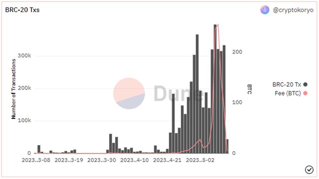 接著我們來看 BRC-20 的數據,在 03/08 BRC-20 問世之後,直至 3 月底開始,BRC-20 的