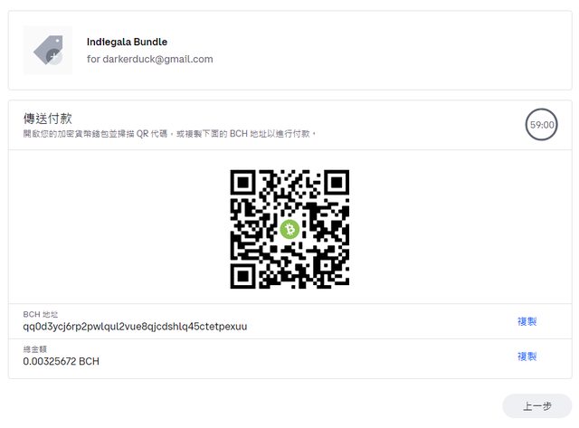 上面indiegla網站跑個流程就知道了。反正不用實際付款也可以跑到BCH付款頁面。
