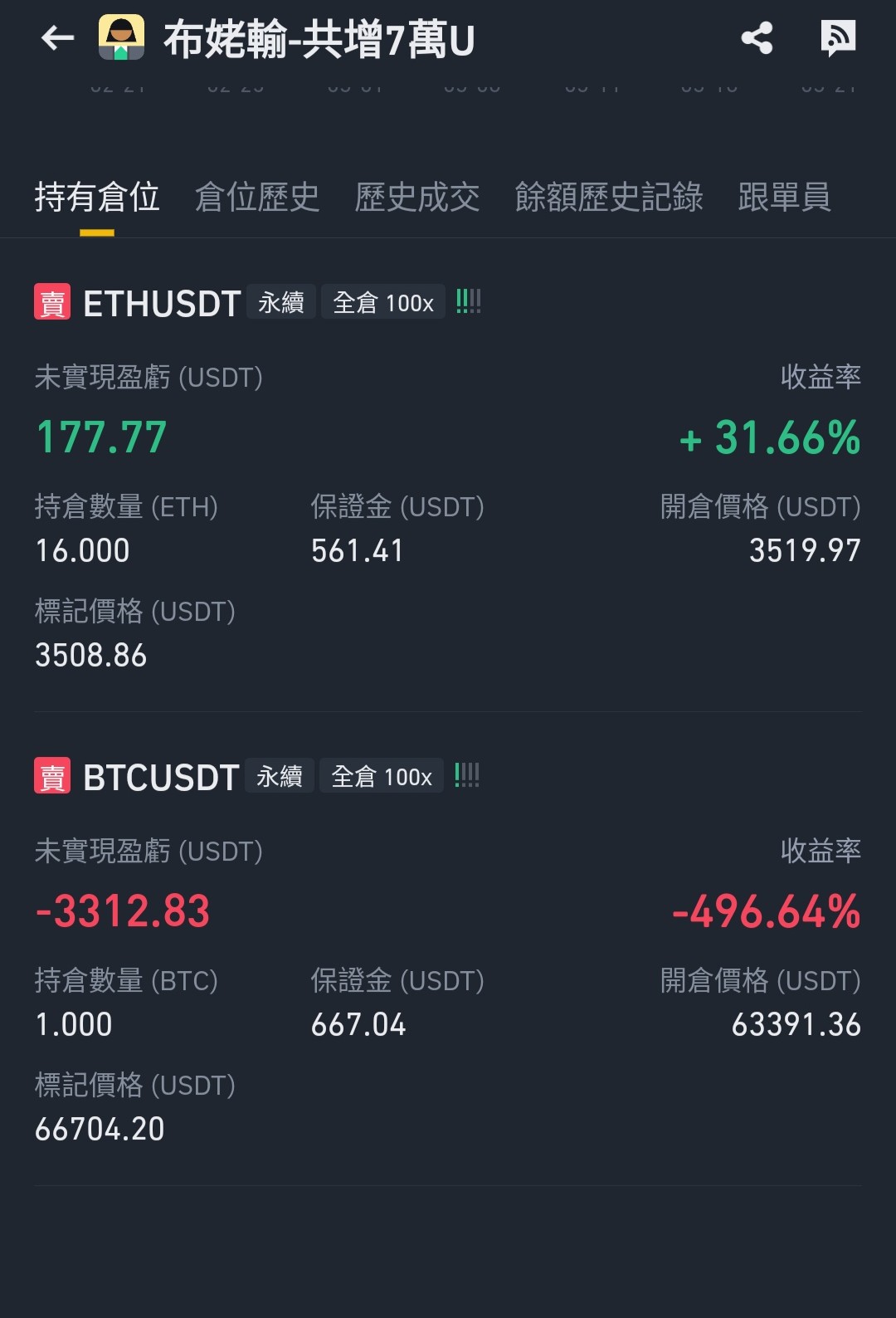 → royroy666: 合約跟布大學 真假= = 布大帶單戶盈虧已經快賠10萬U惹 03/21 08:29