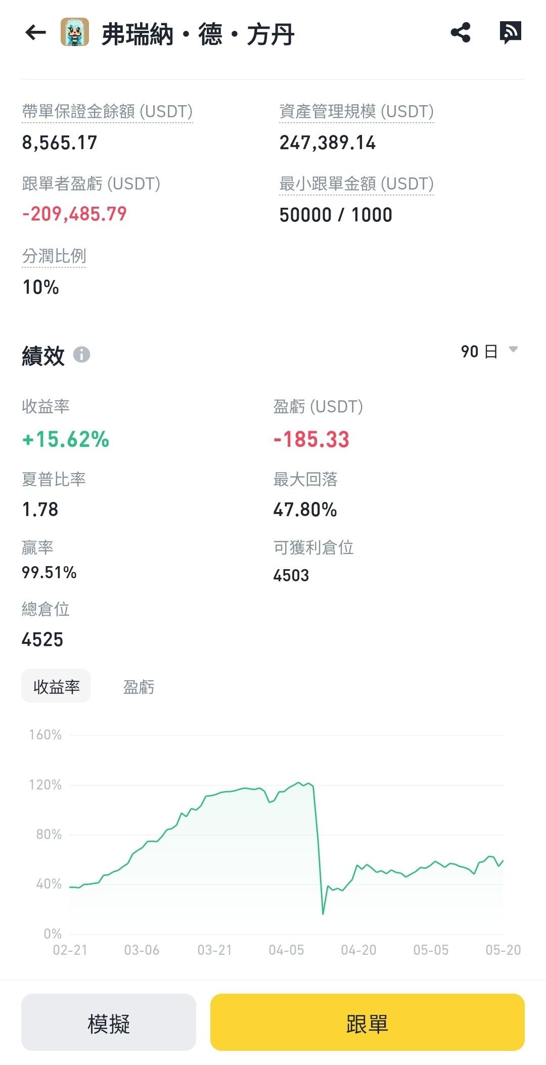 → fan415: 勝率99.51%,遇到那4月山寨跌30幾%都沒死,但還是要血虧 05/20 16:57