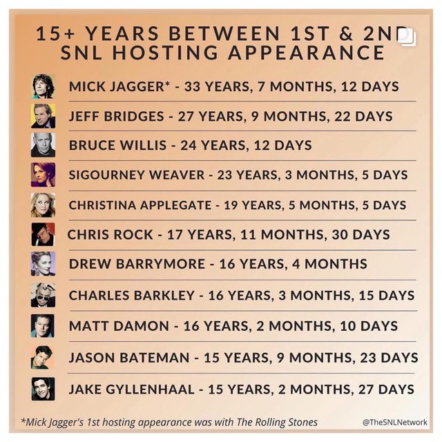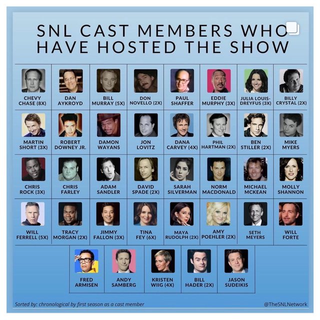 ③SNL的確在前期更偏好男性藝人擔任主持-曾經有4個時期客座主持人連續十集都是