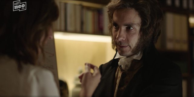 結果好死不死,這回爸爸找來支援的埃及學家 Nathalie Vallon就是母親生前最得意門生,也就是童年時把母親關愛都給吸走的外來大師姊!這種「高徒比子女還親」的親情怨懟許多學者家庭都屢見不鮮... 倒是這些考古學家有別於藝術史家投注鑽研的扭曲執念,這集由 19 世紀初埃及學創始人「商博良」Jean-François Champollion擔綱「藝術之靈」來給她知性感性的點通。知性上,這商博良應是 Florence 這集惡補考古學知識的智識投射,查案見解並非真由商博良之魂引導出來、而是她自己努力推理只是腦中想個商博良出來趣味對話;而感性上就苦澀回視自身與家庭: