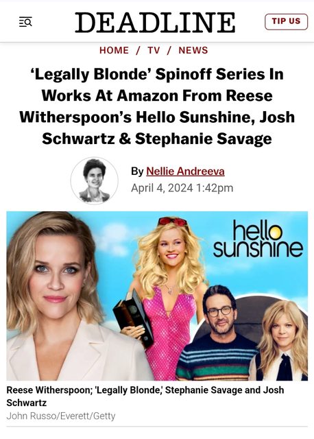 Amazon MGM將與她的製作公司Hello Sunshine合作,推出改編自2001年的知名喜劇電影Le