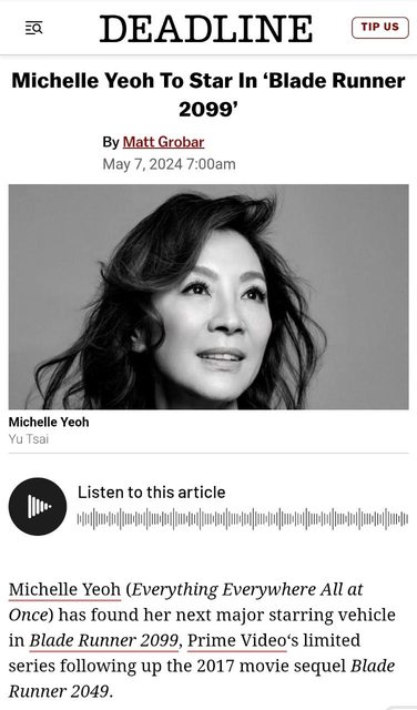 Amazon預定,電影2049的續篇迷你劇,但楊在劇中角色細節並未透露。