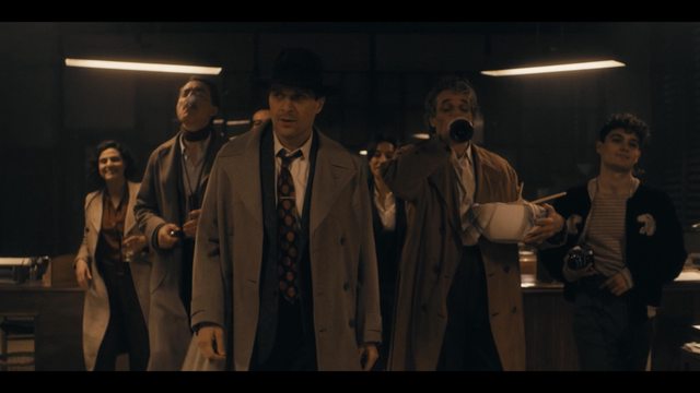 這既是報社題材而且還在「鉛板印刷」年代,還真有某集攝影配樂集中火力迎接 "M-A-F-I-A"五個鉛字堆出高潮!雖然這樣熱血沸騰有點中二 XD 但這更對 Disney+目標觀眾那單純正義的少年胃口!這五個鉛字宛如超級英雄的登場只是一例,全劇談黑幫案情大概 30%卻有 70%在談媒體英雄的身影與孤心,著重描繪他們情緒的委屈憂鬱與壓抑宣洩,彷彿每一天能堅持查案就是他們晦澀人生的曙光與救贖;還很喜歡孤獨身影與滄桑背影、風衣台步慢動作進場、以及苦酒滿杯與香菸氤氳... 本劇抽菸戲多到有劇評戲稱「亨佛萊鮑嘉時刻」,我則想到十年前美片《風雲男人幫》。
