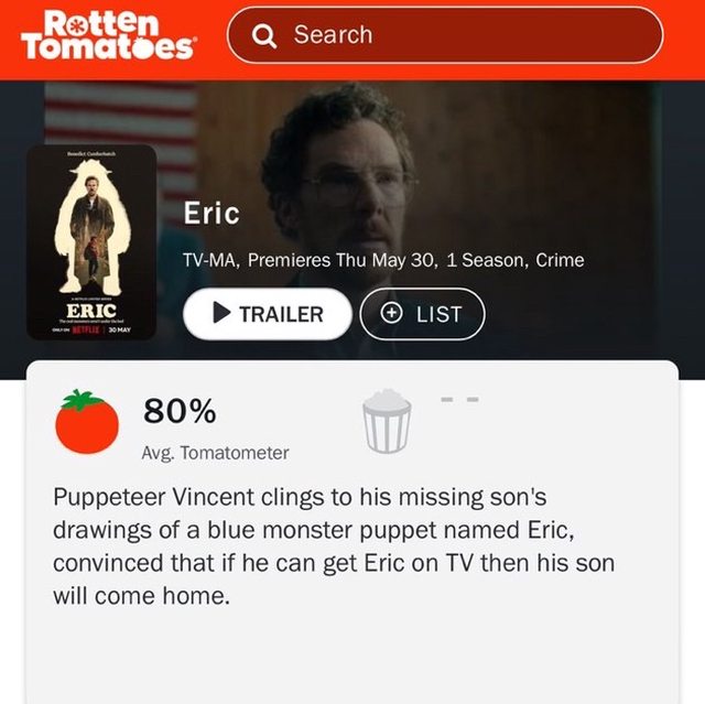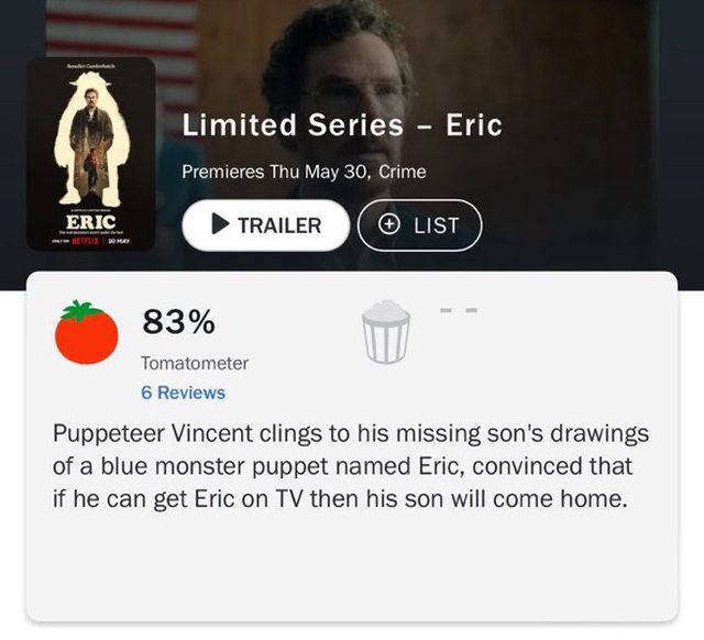 由 Benedict Cumberbatch 主演的《幽暗偶遇》 (ERIC) 在爛番茄上首映獲得 83% 的好