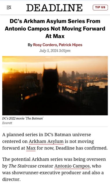 Max宣布不會繼續衍生自Batman電影的影集計畫Arkham Asylum系列。