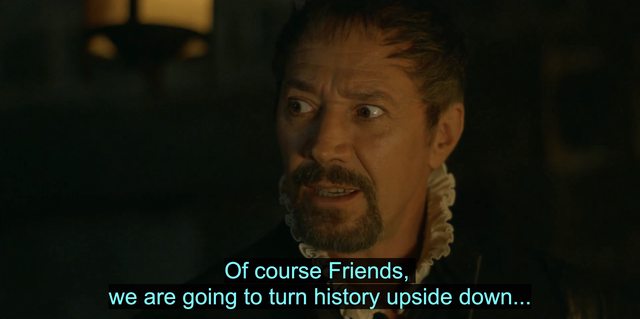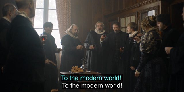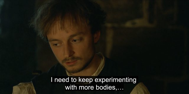 不過本劇更有趣的還是連教會與王權都管不住的「啟蒙科學」:(3) 以歷史年代說來那訴求理性實證的「啟蒙運動」此時還沒到、目前推動這系科學動力的還是「文藝復興」,本劇倒是有兩個人物彷彿銜接兩個時代的科學精神?但與其說科學精神不如說更像學術人欲。這其中傳統科學代表是判官帶來的年輕醫生 Guillaume,他一來先幫人接生搞到母子均死 XD 沒辦法誰叫「獵巫」風聲鶴唳所有助產士都躲了起來... 總之在此可知那時所謂「醫學」未必比女巫與助產士的地方智慧高明到哪去!他在此任務是幫判官檢查「女巫斑點」,往往也是針刺虐待屈打成招才做出業績。